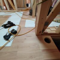 屋内の造作はフローリング張りの段階に入ってきました。使用しているのは西南桜のシルキー塗装品。サラッとした表面の仕上がりが特徴です。