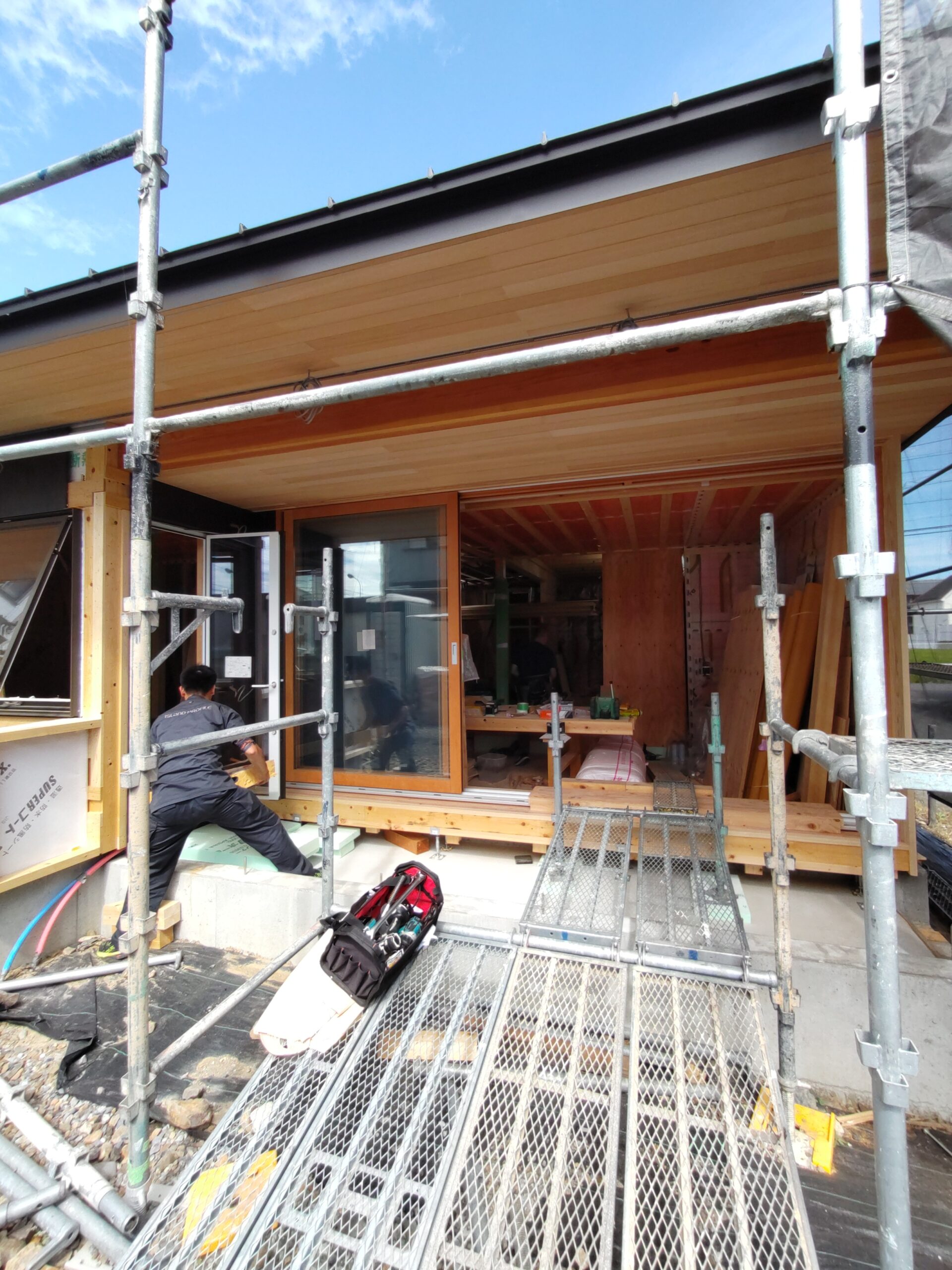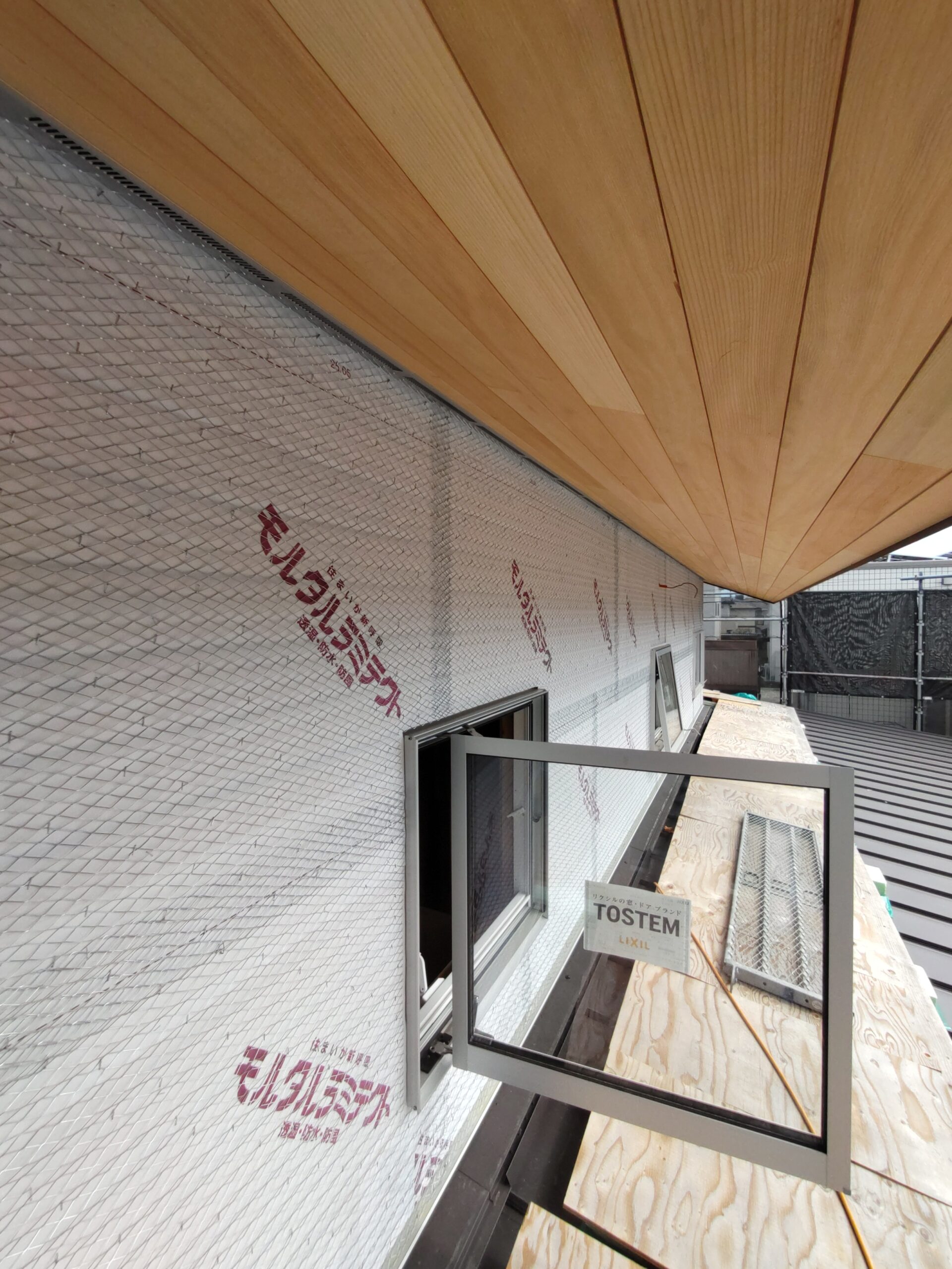 屋根の防水シート敷設工事が進んでいます。これから梅雨時に入り雨天が心配されますが、これでひとまずは安心です。あとはオーダーメイドのサッシが早く納品されるのを待つばかりです。