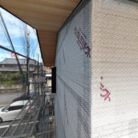 外壁塗り壁用の野地板下地を留め付けています。整然と施工される桧のバラ板。遠目に見ればそのものが仕上材にも見えるかのようにキレイに留め付けられています。この上に防水紙とメタルラスを張り、いよいよ外壁の塗り壁工事が始まります。