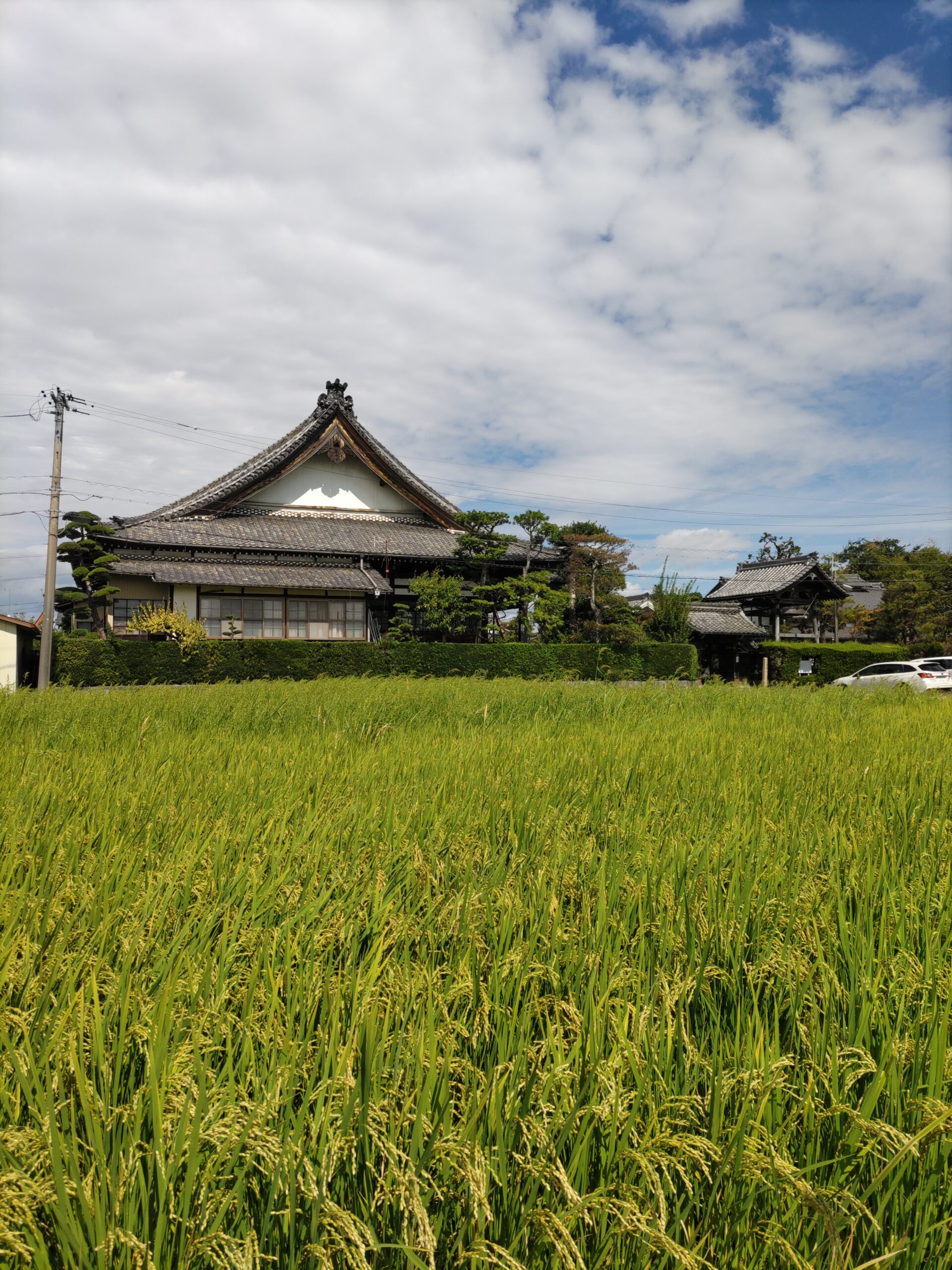 近所で工事用車両の駐車場をお借りしている場所の前に立っているお寺を水田越しに撮ったところ。画になりますね。稲ももう少ししたら収穫時期です。