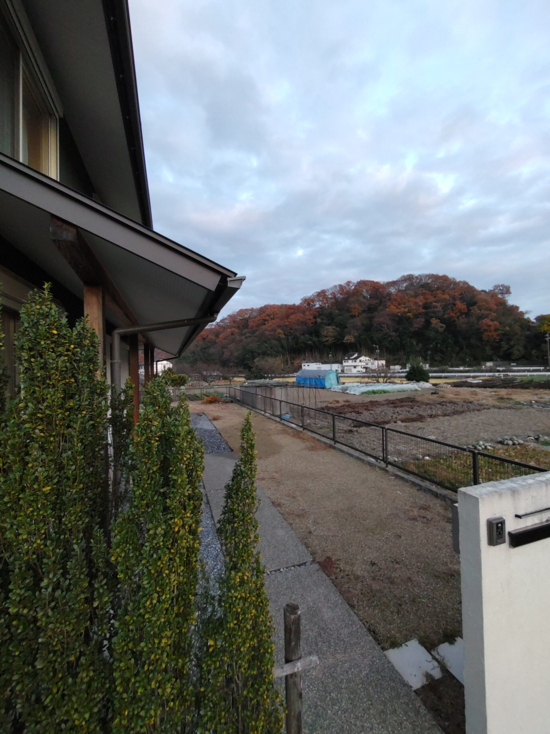 年末の点検依頼と新年のカレンダーをお渡ししにまたk様邸を訪れました。この住宅はいつ来ても周囲の自然が豊かでうらやましい。遠方に見える丘は紅葉が見頃です。そろそろくれも近いというのに今頃が紅葉の季節になるような気候になってきました。HINAちゃんも今や中学1年生、月日の経つのが非常に早く感じられます。