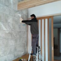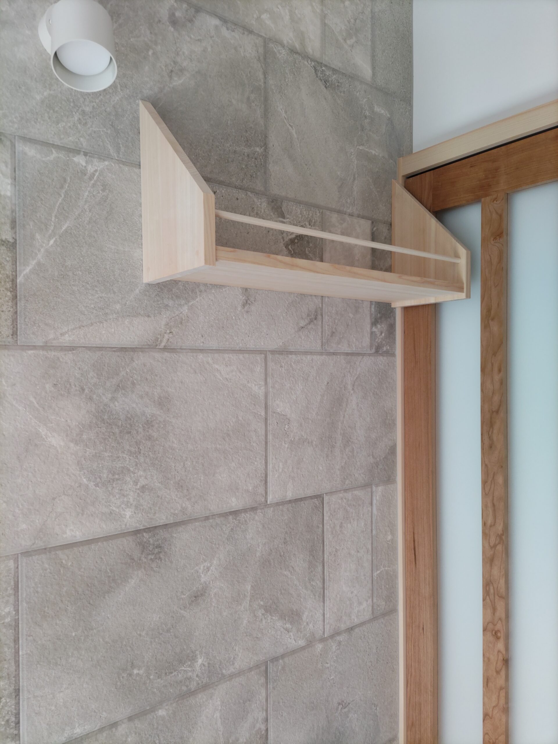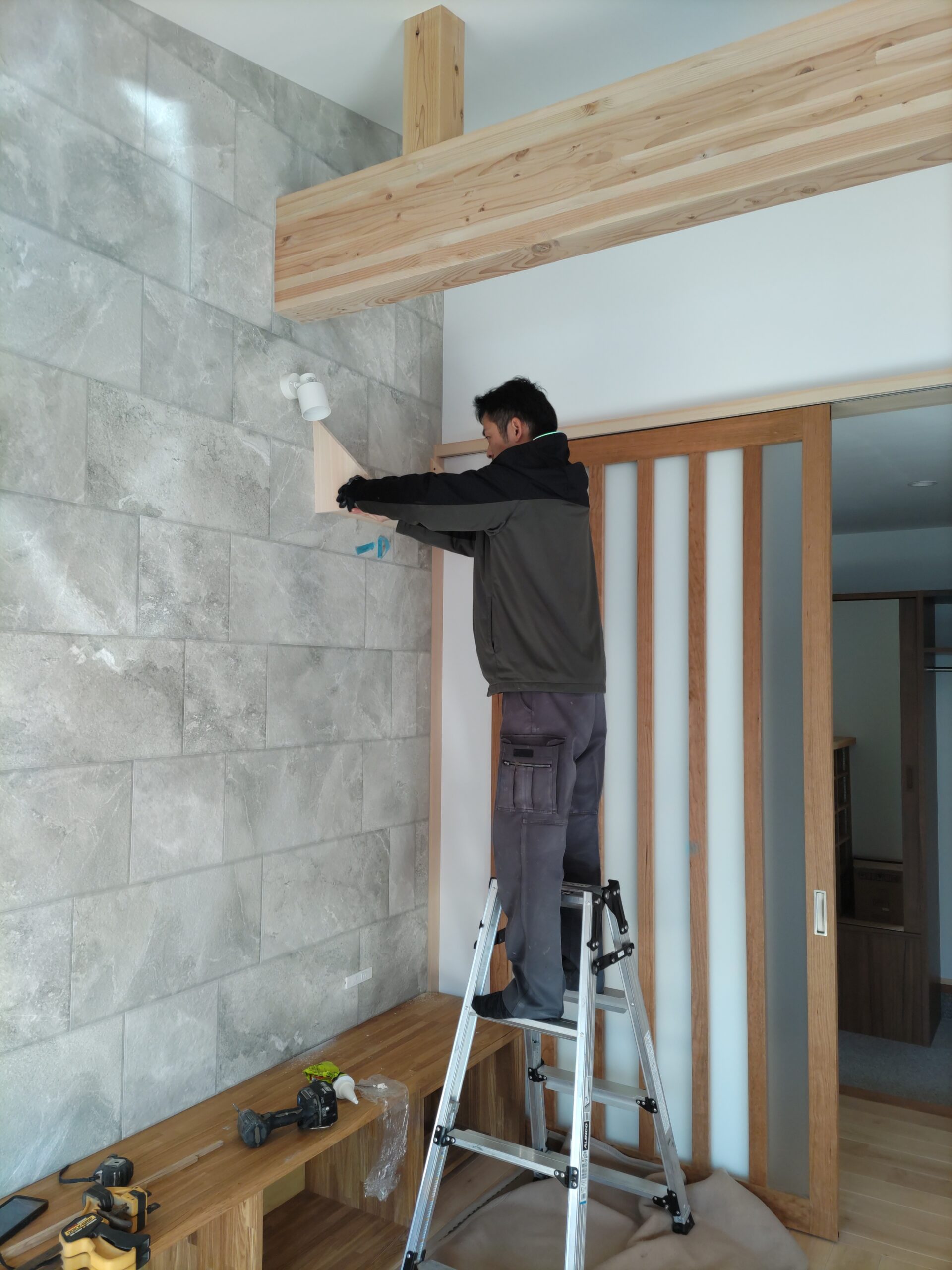 h谷川棟梁が再び現場に見参。s様からご希望のあった形の神棚を据付にやってきました。神棚といっても社を載せるような大きなものではなく、御札と榊を載せるだけの大きさのものでよいとの事でこのサイズ感となりました。背面がタイル貼のためビスを一本留めるのにもふた手間くらいかかります。何とか留め付け終えました。