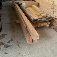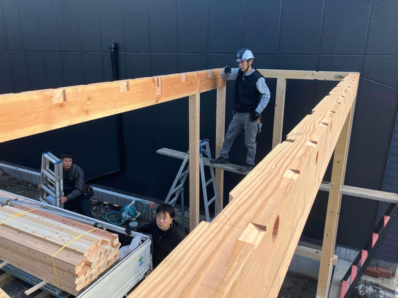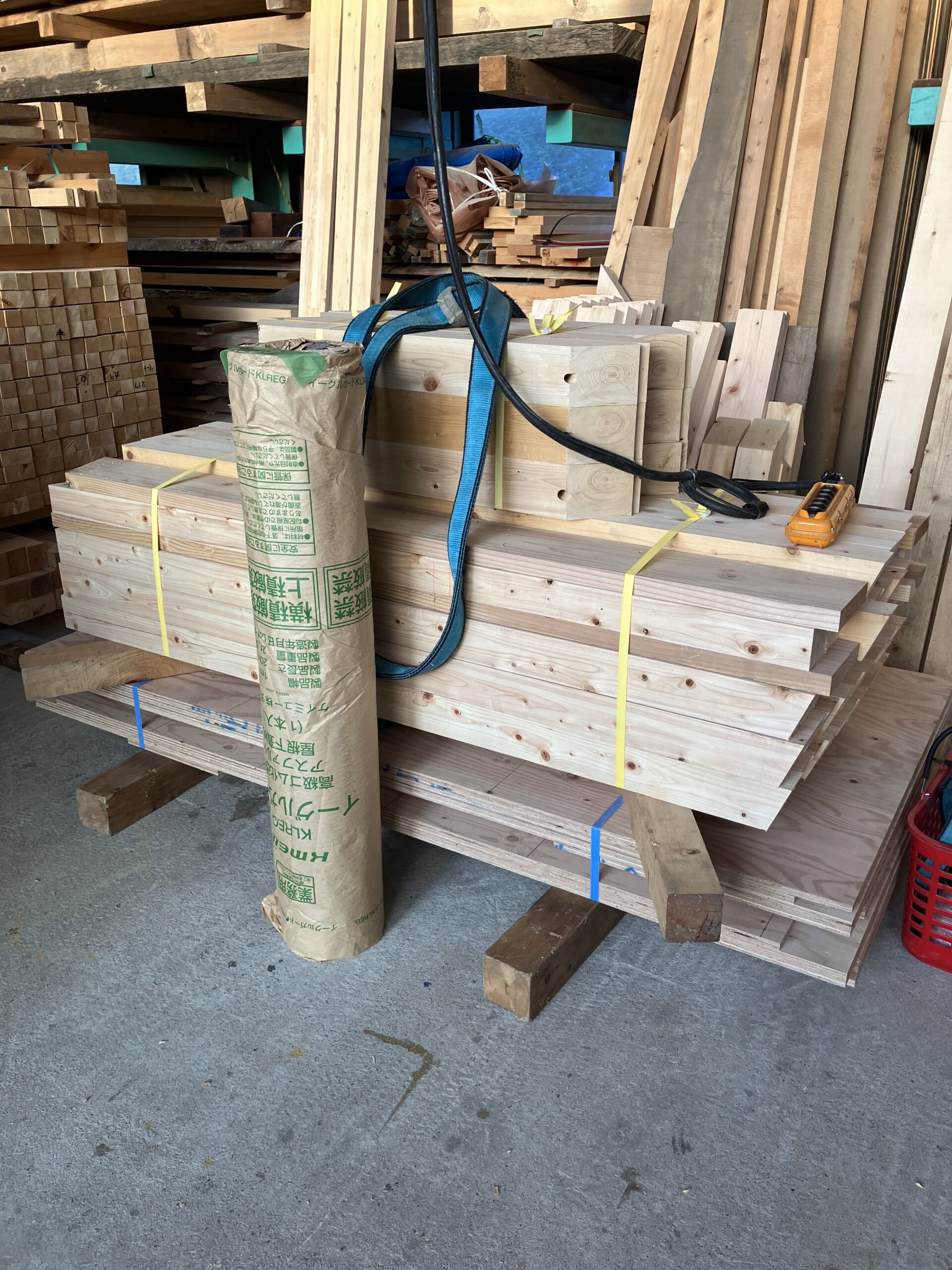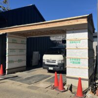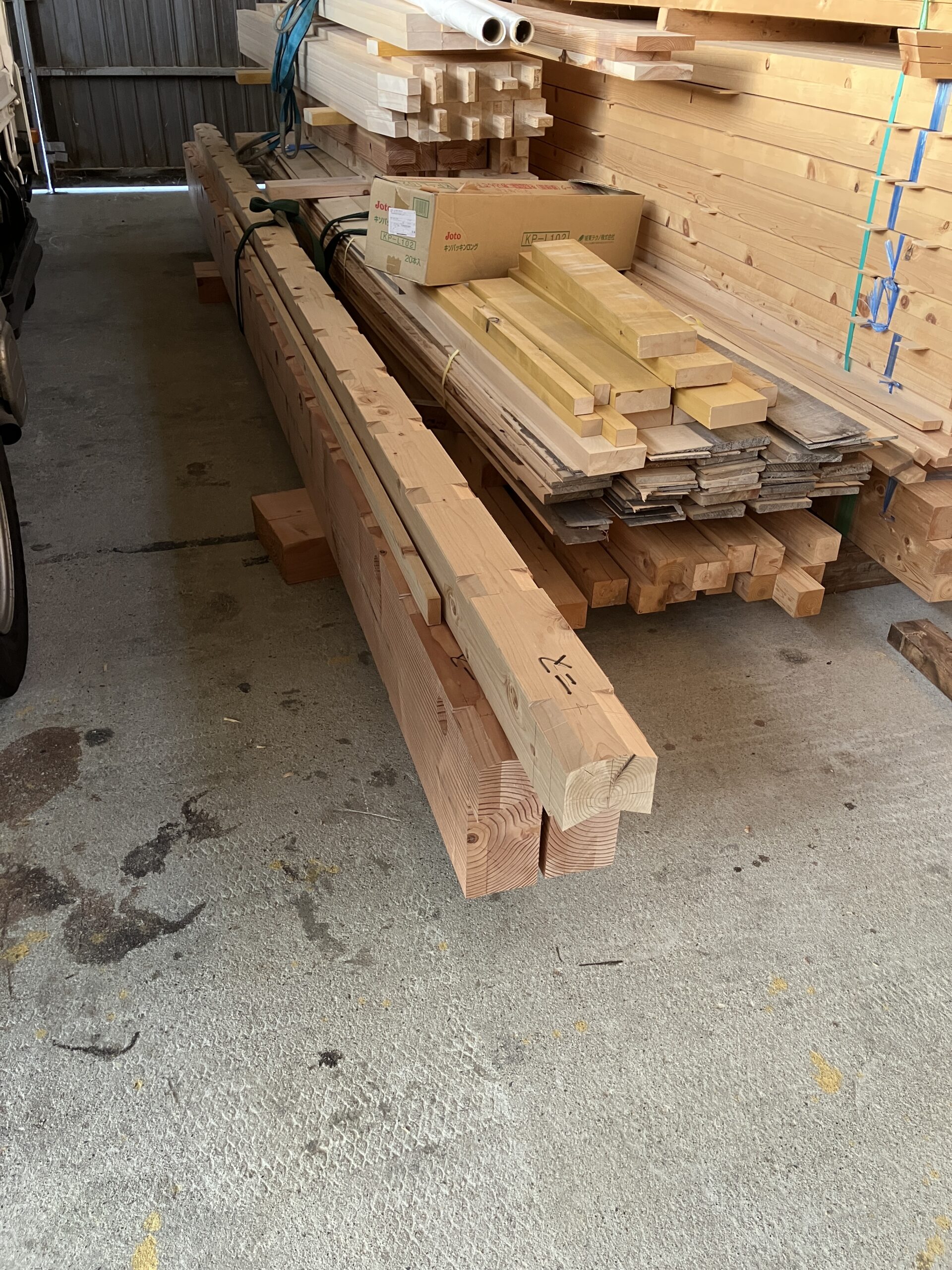 完成見学会が無事に終わり、現場ではo様手配の外構工事が進んでいます。門を構えてしまうと、中の工事がやりにくくなってしまうので、本当は門も建てて終わりたいと言うのが建築屋の本音ですが、外構屋さんの身になるとそんな冷たい事は言えません💦今日は、本社に行って倉庫の中を見てみると、大工さんが刻んだ門の材料が出番を待っていました。来週の11日に棟上げ予定です。