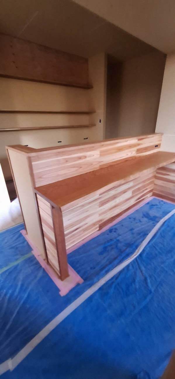 お父様は、やっぱりカウンターは無垢の耳付きにしたいとの事で、急遽本社から4枚ほど運んで来て選んで来ました。赤身と白太があるチェリー材を選ばれました。仕上がりが楽しみですね。