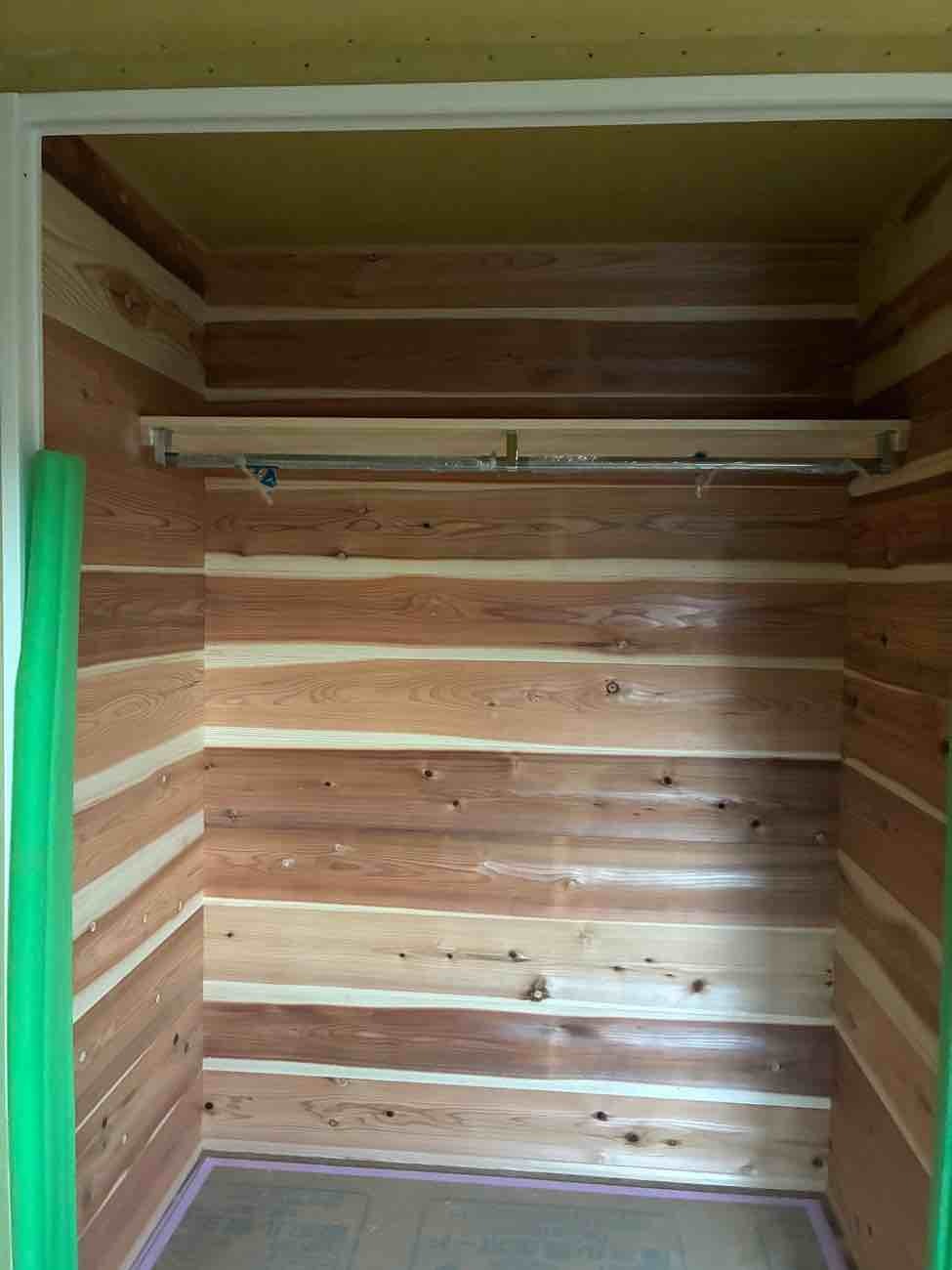 収納部分には、杉の相ジャクリ板が張られました。調湿性がある材料で、閉め切っておくことの多い収納部分にお勧めしています。k池大棟梁が加工してきた造作棚も取り付けられてきています。k保木大工さんが応援に来ているので、スピードが更に加速してきています。