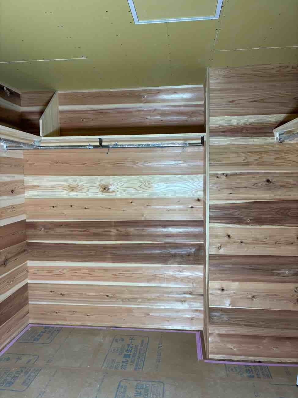 母屋は、2階ホールの杉羽目板張りを終えています。ところどころ、壁のプラスターボードも張っています。(📸:h典棟梁)