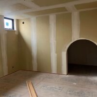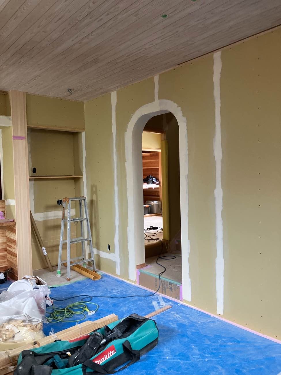 階段の手すり壁や、各所のカウンター下地、アール壁(こちらは洋風)の下地も取り付けられました。k保木大工さんが、こちらにも応援に来てくれています👍