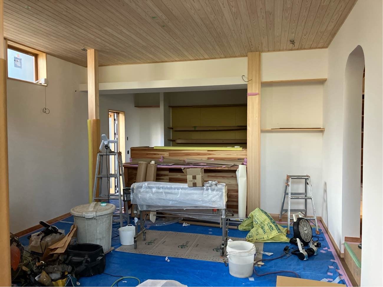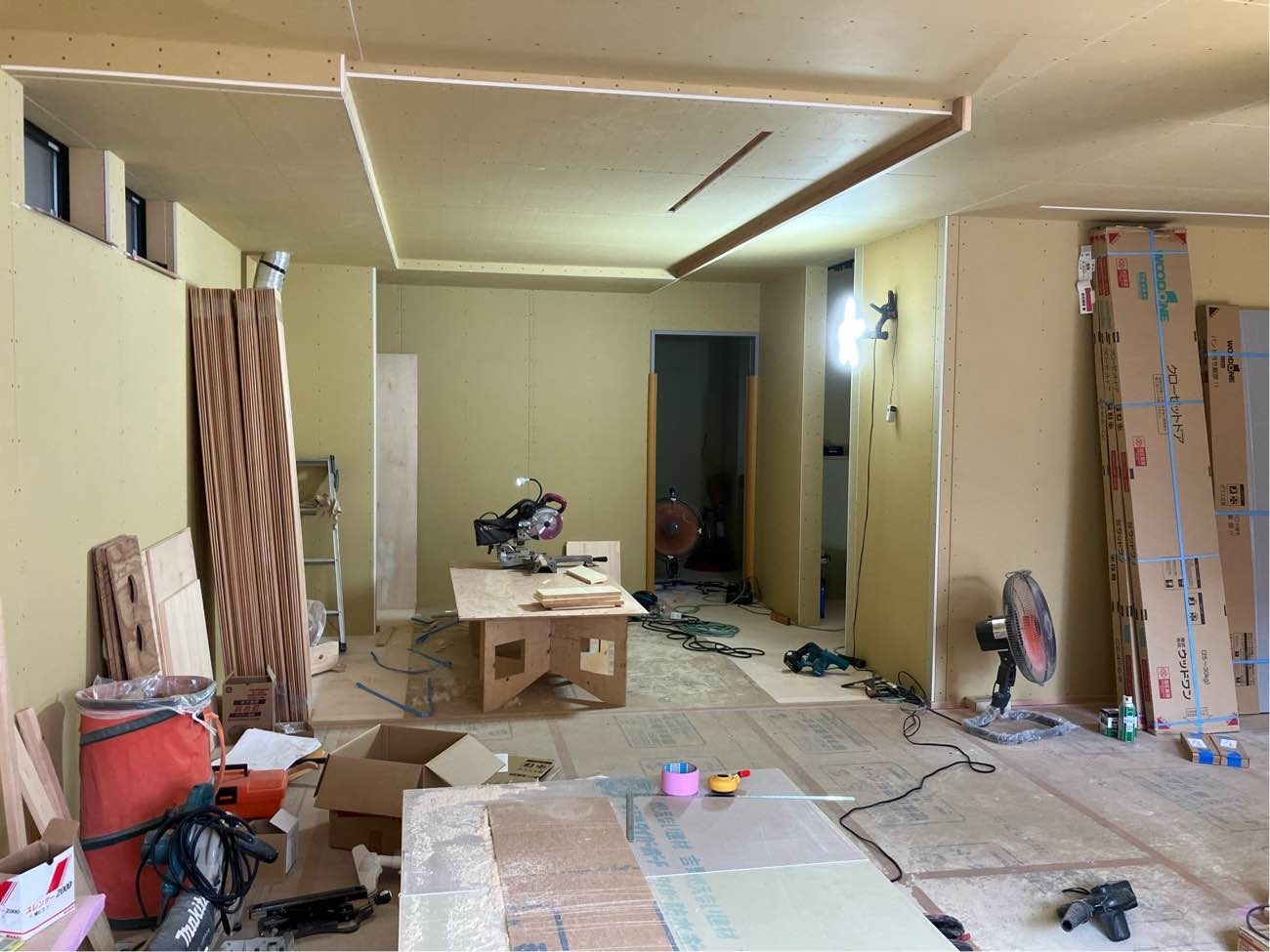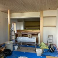 母屋も、内装工事に着手しています。クロス工事前に、Eエスさんが塗装を施した様子です。