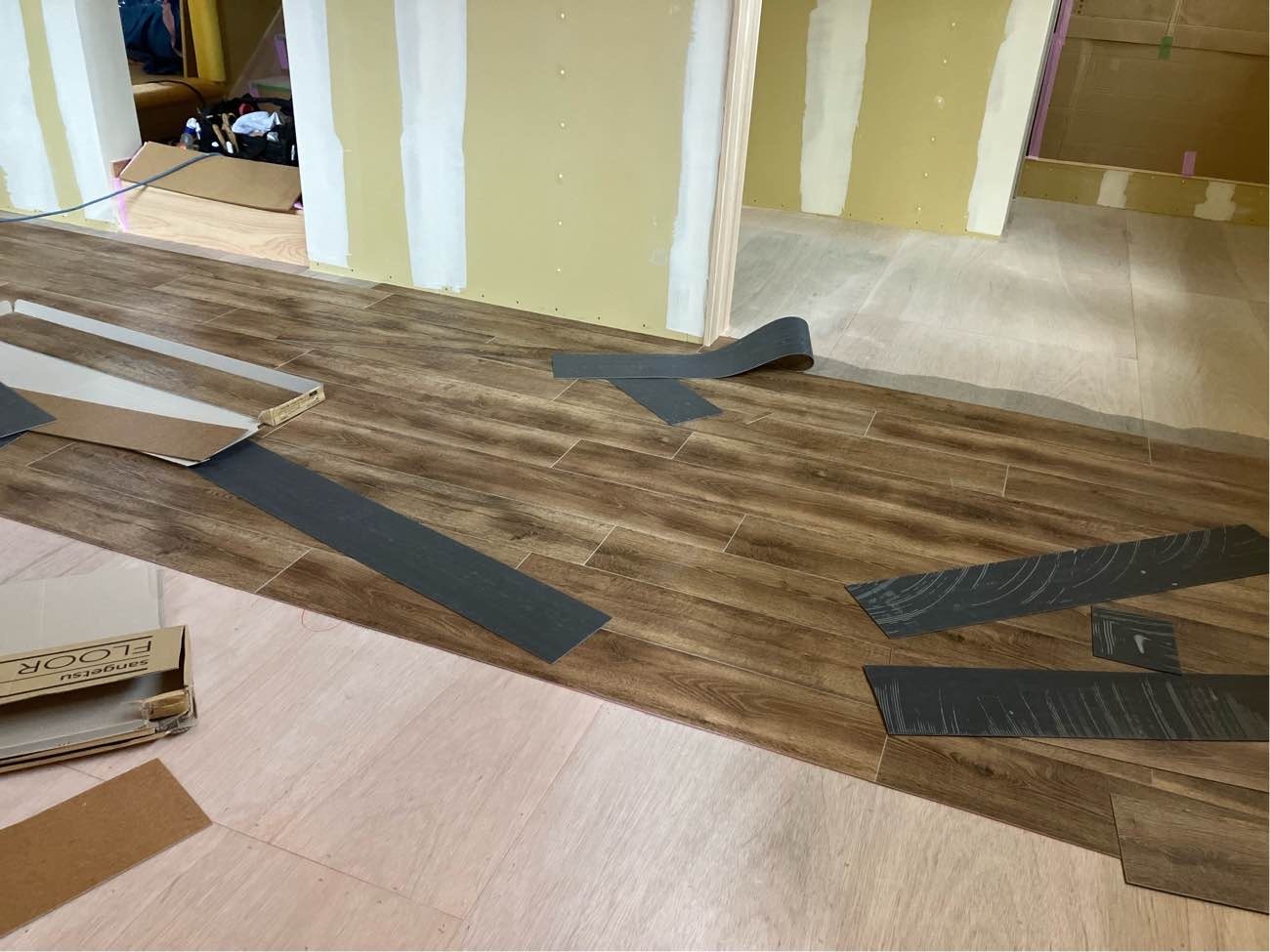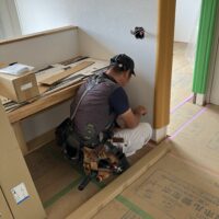 母屋は、h典棟梁が1階の床や洗面前のカウンターを造作しています。床は、水廻りにフロアタイルを採用されましたので、フローリングとの厚みの差分調整ベニヤを張っていきます。