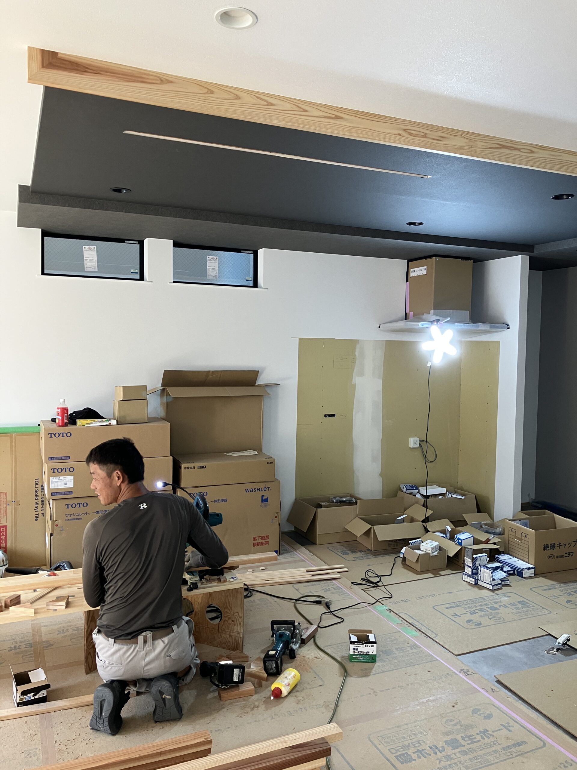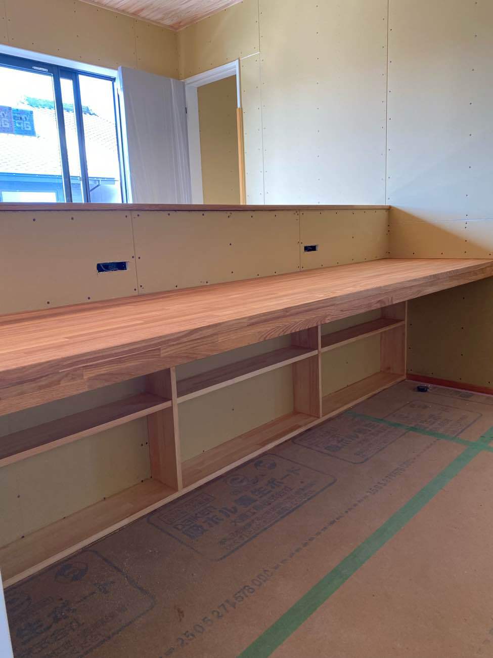 エアコン用の小さなキャットウォークや1階洗面後ろのカウンターなどの造作も完了しています👍明後日の日曜日は、クロスやタイルなど内装の打合せを江南事務所で行う予定です。大工さん達の丁寧な造作工事に、仕上げ工事で化粧され、どんな空間になるのでしょうか?楽しみです。