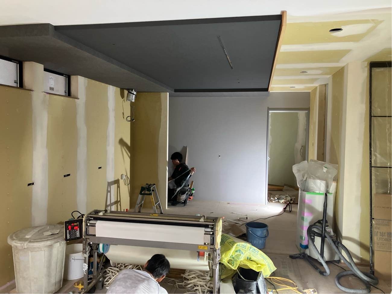 現在は、s美さんがクロス工事に入っています。まずは、下地処理。凹凸を無くす為に、ボードのジョイント部分にパテ処理を行っています。