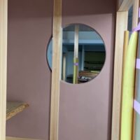 旧家の壁に似た色を、丸窓周りに選ばれました。クロス工事が終わったので、k池大棟梁が再び来られて、造作手すりも取り付けられました。