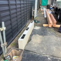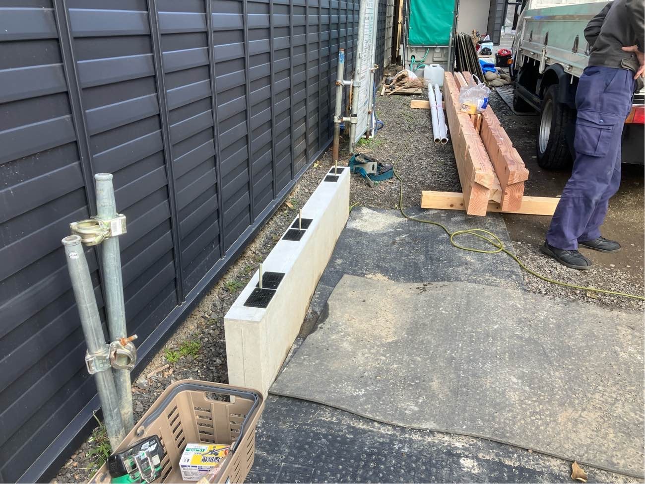 前面道路の景観を良くするため、今回は門も新築しています。基礎工事を行いました。外構工事が絡むので、基礎工事で一旦休工です。