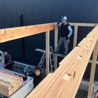 h典棟梁は、さげふりと言う道具で建物の矩を確認しながら、柱や梁を仮固定している様子です。