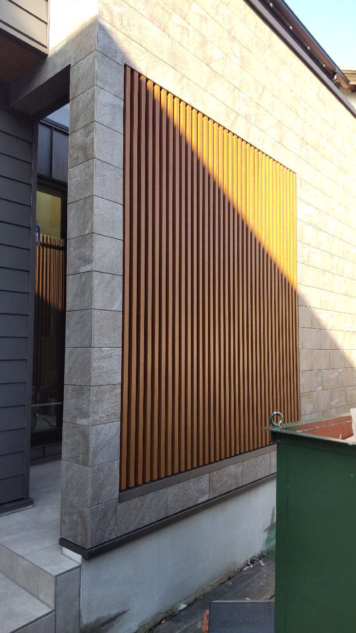 外部は、y口技研さんがタイルを貼っています。リビング前のアルミルーバーは、s浦サッシさんが取り付けました。離れからの目隠しになり、敷地も奥まっているので、カーテンは要らないかも知れないですね。