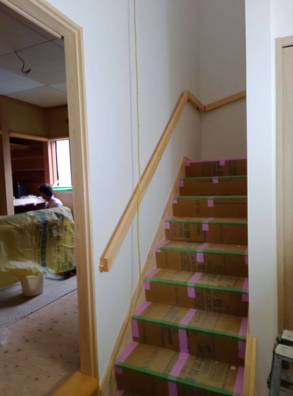 母屋も、内部は階段が掛けられました。階段の形状や巾木を付けるか付けないか、見た目と機能性の狭間でかなり迷われていましたが、イメージ通りでしょうか?