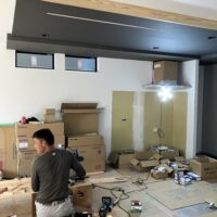 母屋は、h典棟梁が再登場。クロスが貼り終わったので、キッチン上部の天井にルーバーを取り付けに来ています。f井電気のh場さんも、機器類を取り付けに来ています。コンセントやスイッチ、照明器具に分電盤、換気設備、考えてみると結構取り付ける物いっぱいあります。