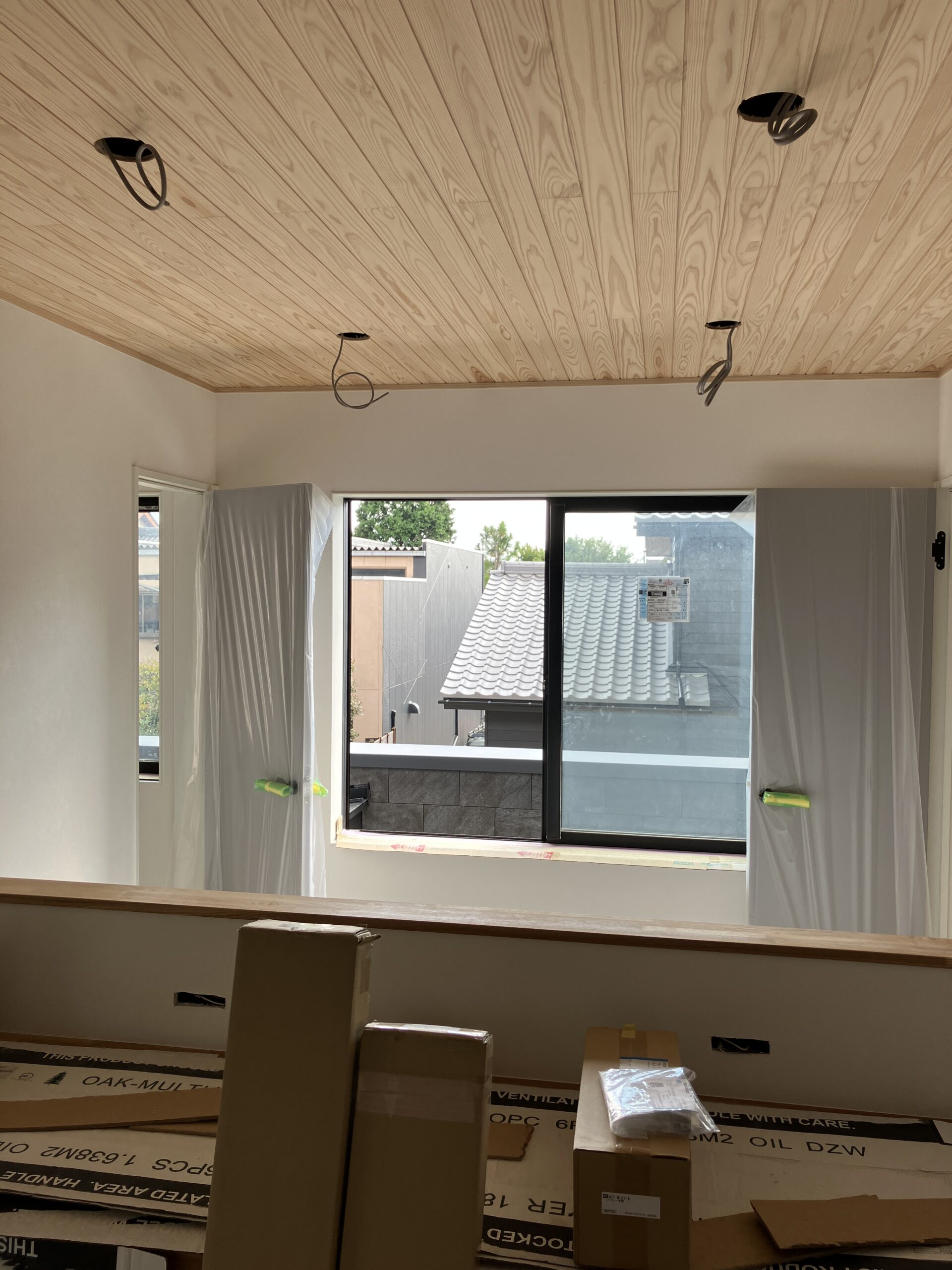 離れの2階は、天井の下地組を終えて、無垢の杉フローリングも張り終えています。補助金の金額分で節ありから節無しにグレードUPです👍