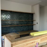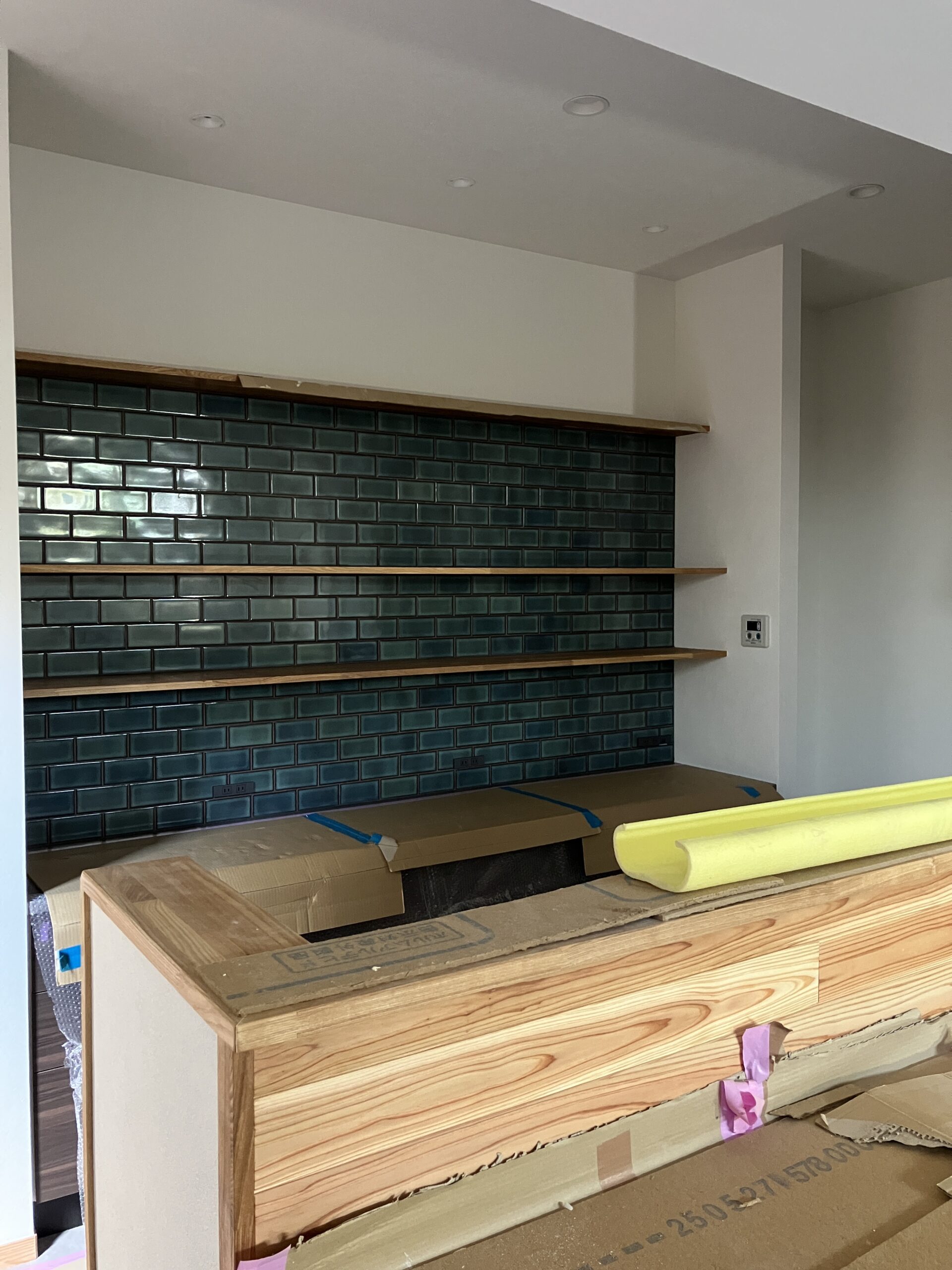 離れも、カップボード上のタイルを貼り終え、各種機器類の取付に入っています。
