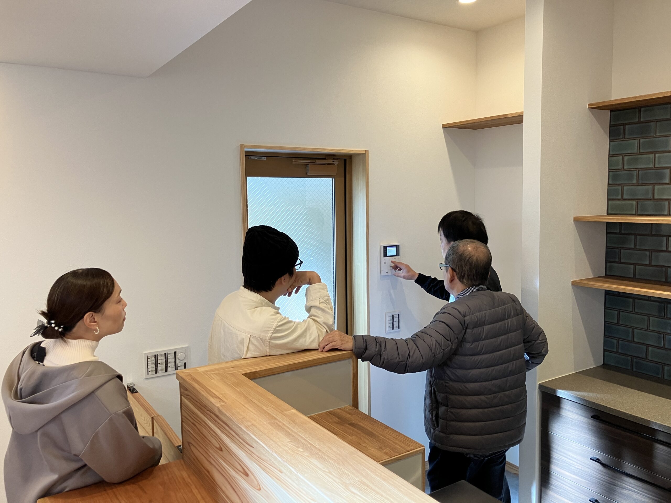 本日は、建物のお引渡しでした。s水監督が、各種機器の取り扱い説明をしている様子です。