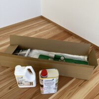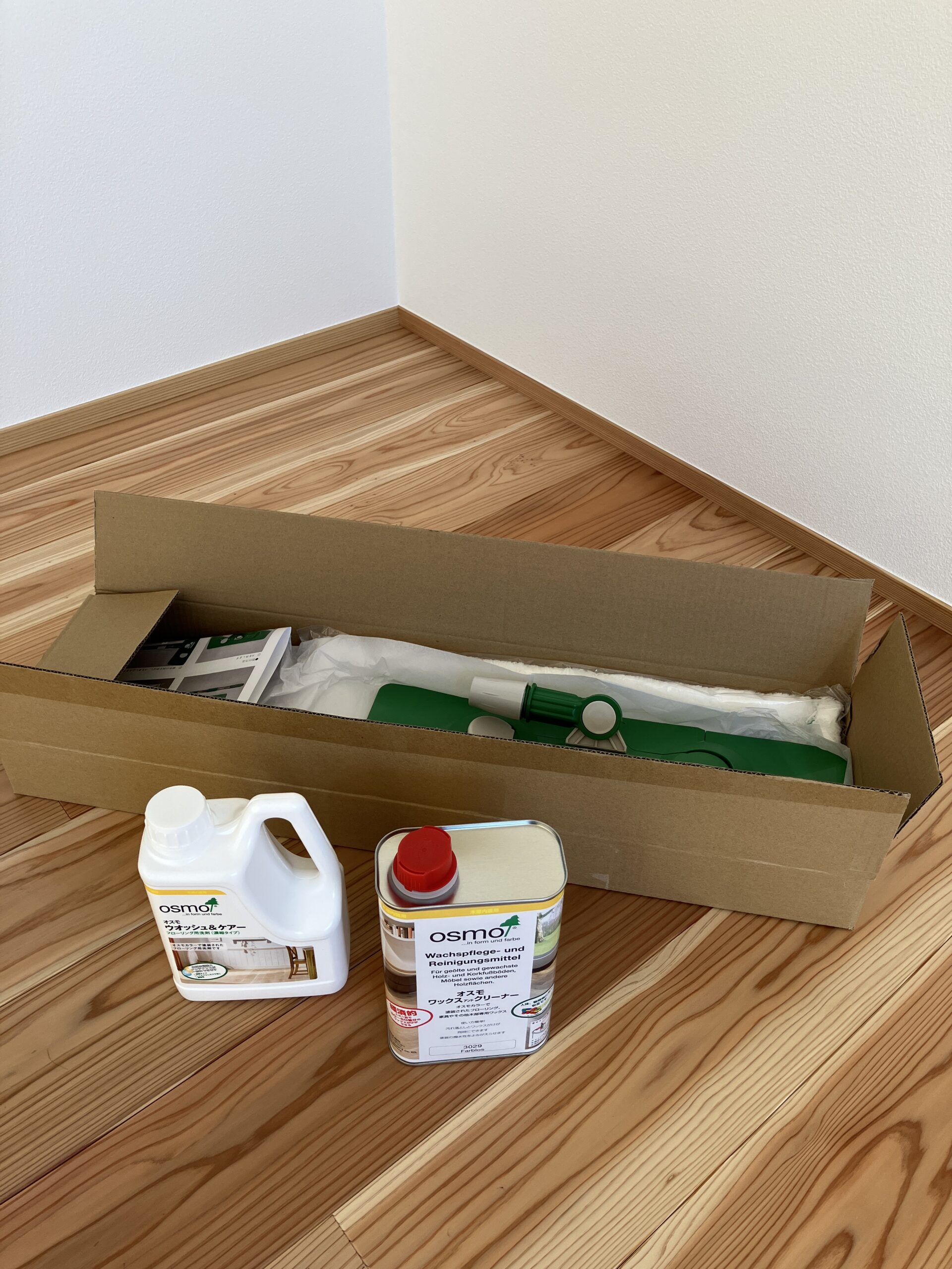 引き渡し時に、会社から無垢材の床に使っていただけるクリーナーとワックスをお渡ししています。よく、無垢材はメンテナンスが大変じゃないですか?と言う質問を受けますが、無垢材だから傷などが付いてもメンテナンスが可能なのです👍