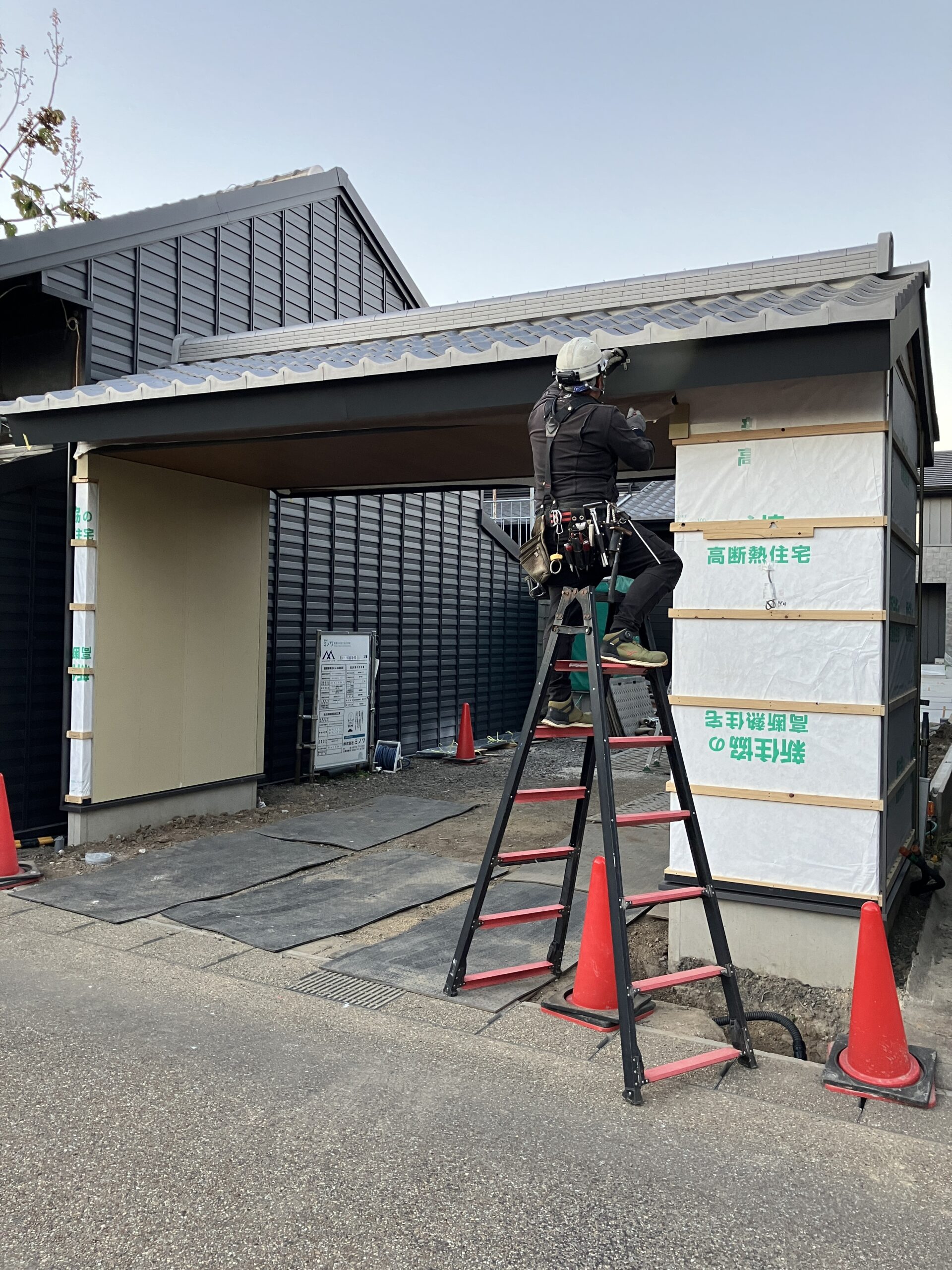 母屋は軒裏のサイディングを張っています。準防火地域になので、ミノワでよく張る羽目板は張れないので、木目調のサイディングを採用しています。景観条例があるけれど、準防火地域・・・風情ある町並みづくりを進めているエリアですが、少し矛盾を感じます・・・。告示で軒天の羽目板仕様を増やしてもらえるといいなぁと思ったりしています。