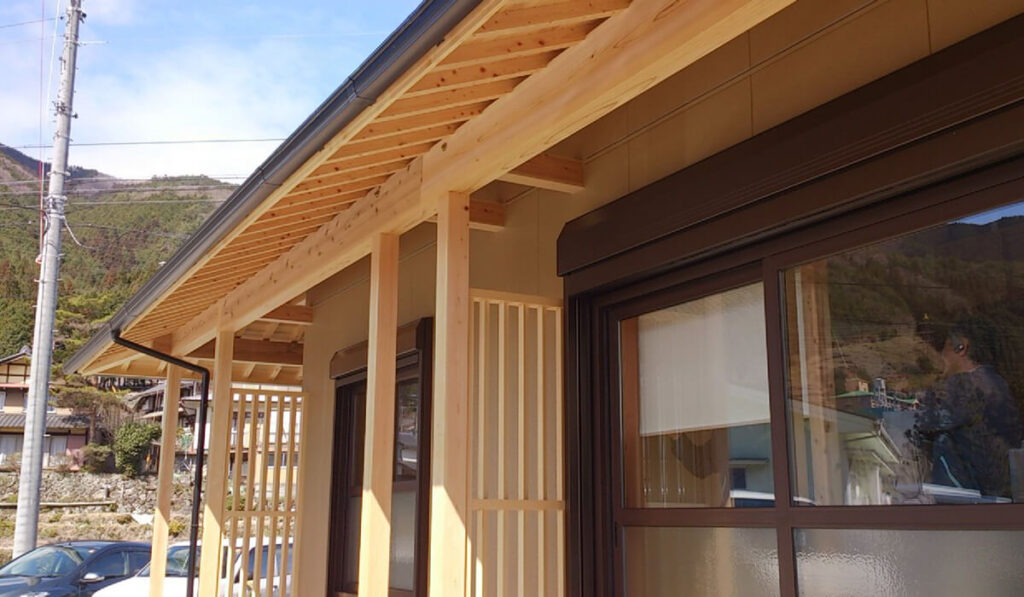 下呂の山々を背景に建ち、色彩のコントラストが映えるyn様邸。和風の佇まいながら、屋根をガルバリウム鋼板横葺きで仕上げ、軽快な印象を与えます。玄関を入ると木材の香りがします。床、壁、天井に杉の無垢材をふんだんに使用、壁には和紙のクロスを貼っています。冬期の寒さを考慮し断熱材に高性能グラスウールと高性能フェノールフォームを採用した高断熱、高気密住宅です。