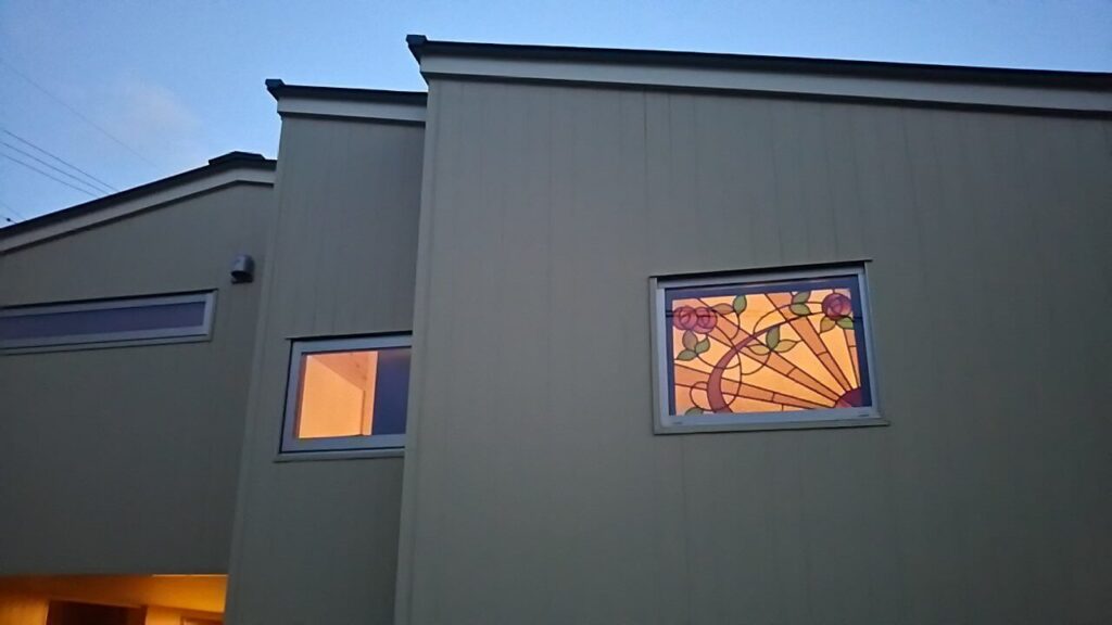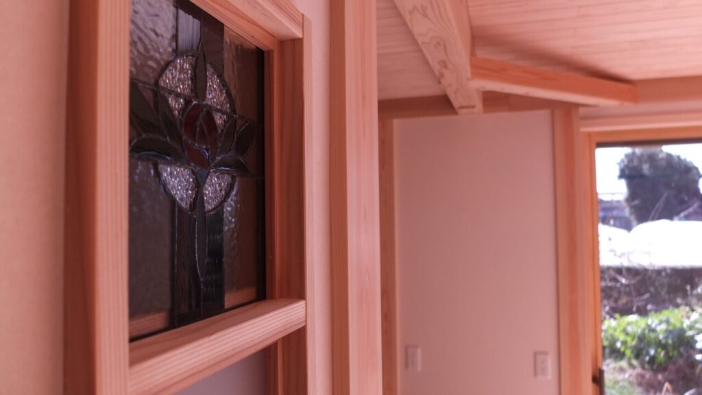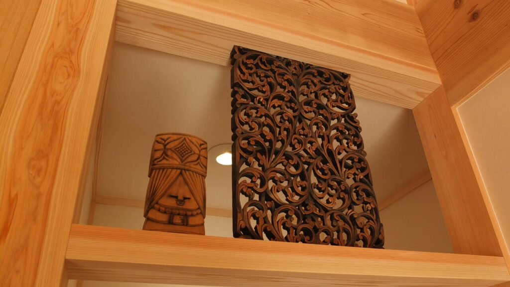 海外旅行先で手に入れられたお土産のタイル、ステンドグラス、飾り格子などを仕上に組み込み、内部はそれらの展示室のような様相を呈しています。
