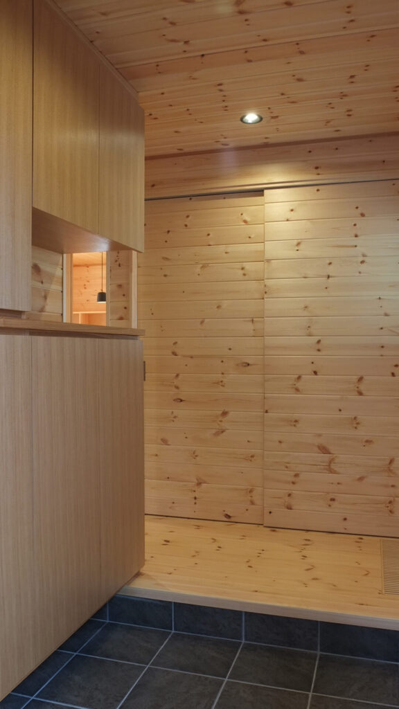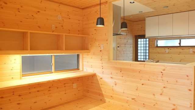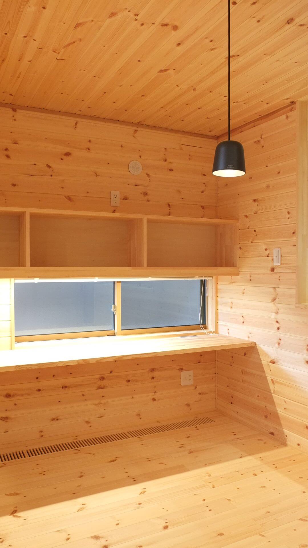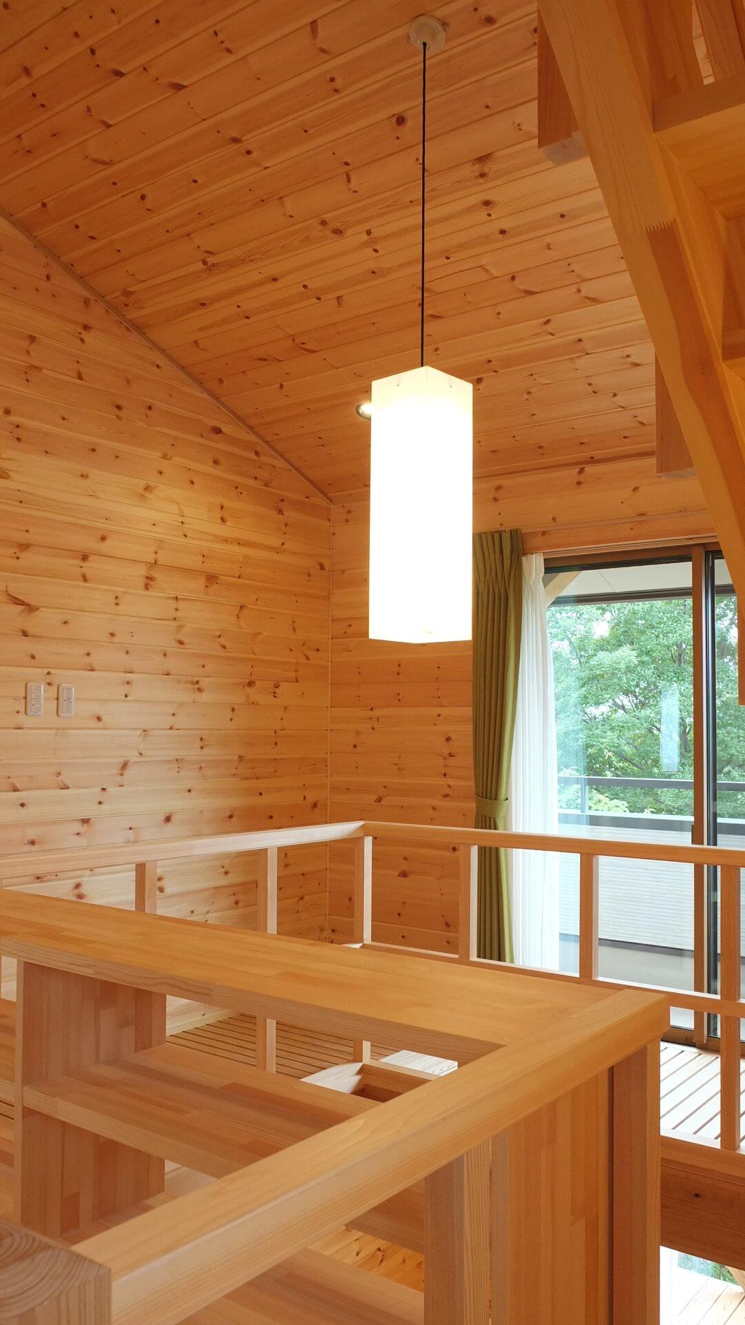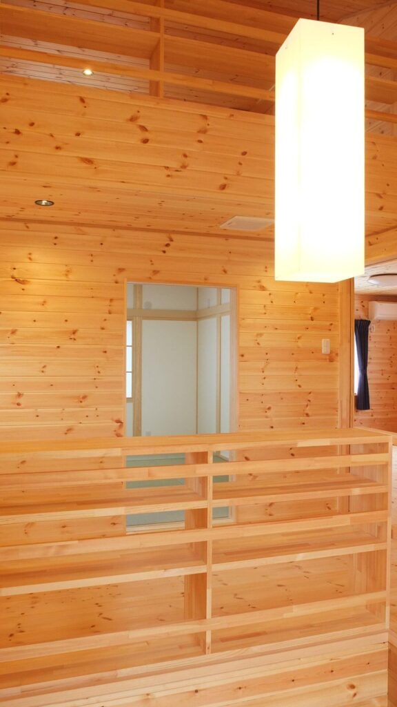 n様のご実家をリフォーム工事された設計士さんとの打ち合わせで、ご実家同様、室内の内装はほとんどすべてパインの羽目板やフローリングで統一。一見山小屋風の屋内と南側の自然豊かな眺望も相まって、自宅にいながら別荘地に来ているような感覚をおぼえる空間となりました。