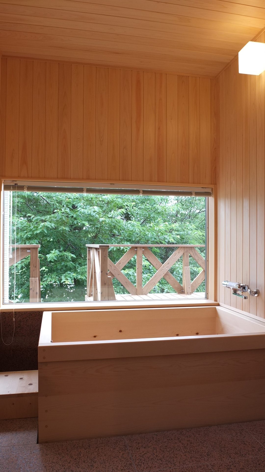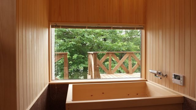 ゆったりと流れる川を臨む大きなウッドデッキと槙の風呂