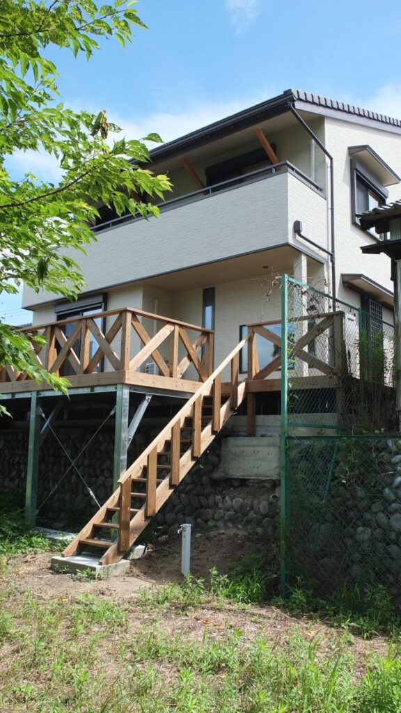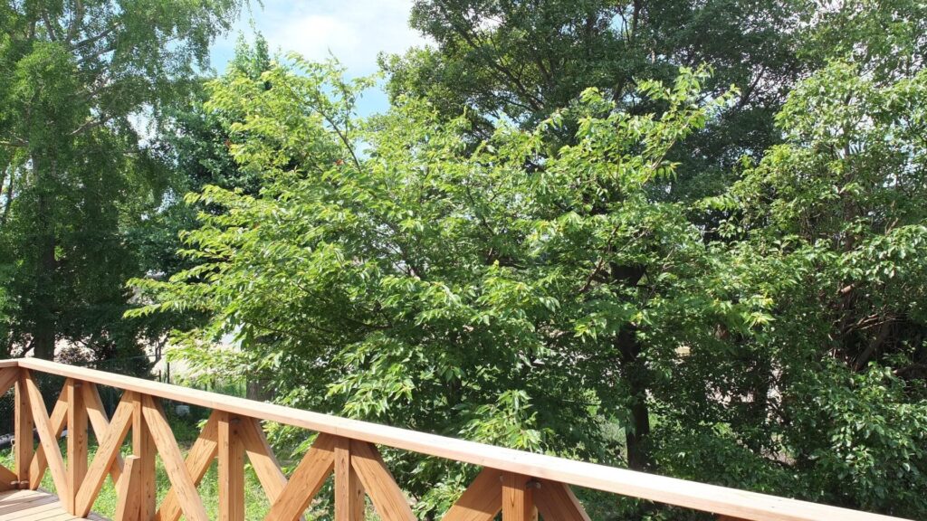 街の中を流れる川の堤防の上という立地から、南側には滔々と流れる川の流れ、河川敷の自然、川にかかる鉄道の鉄橋を眺める事ができます。河川敷に向かって持ち出した大きなウッドデッキや一段下りた広場では川の景色を眺めながら休日にはのんびりと過ごす事ができます。同じく南面に配置された浴室には木の香り漂う高野槙の浴槽を据え、室内の内装を桧張りとしています。お仕事で疲れて帰ってきた時は浴槽に身を沈めn様の好きな鉄道を眺めながらゆっくりとした時間を満喫できる事でしょう。
