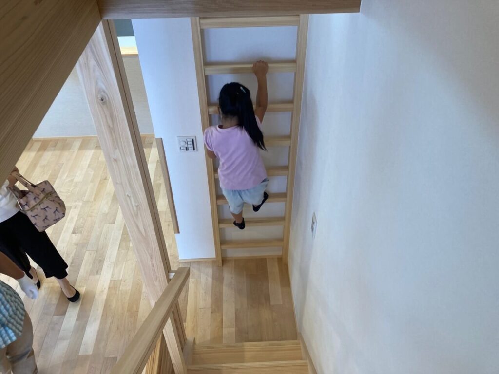 完成見学会にやってきたERIちゃんにさっそく上ってもらい、他のご来場者にもお手本を見せてもらいました。『早く引っ越して友達を呼んで遊びたい』と、喜んでもらえて頑張ってつくった甲斐があったというものです。