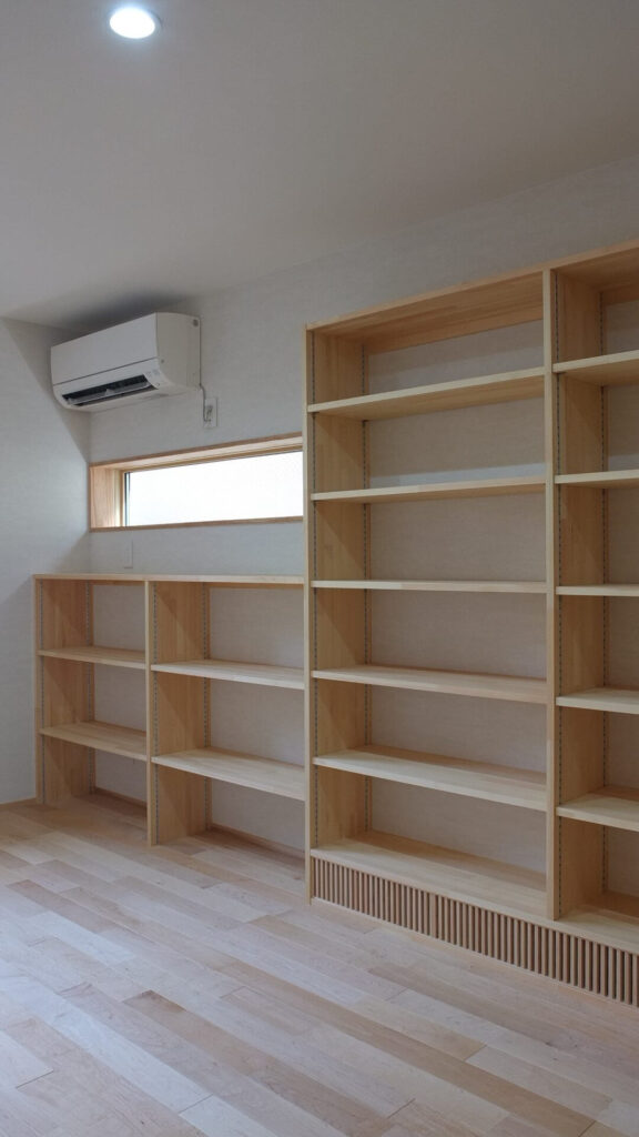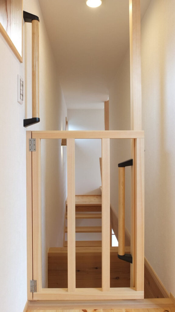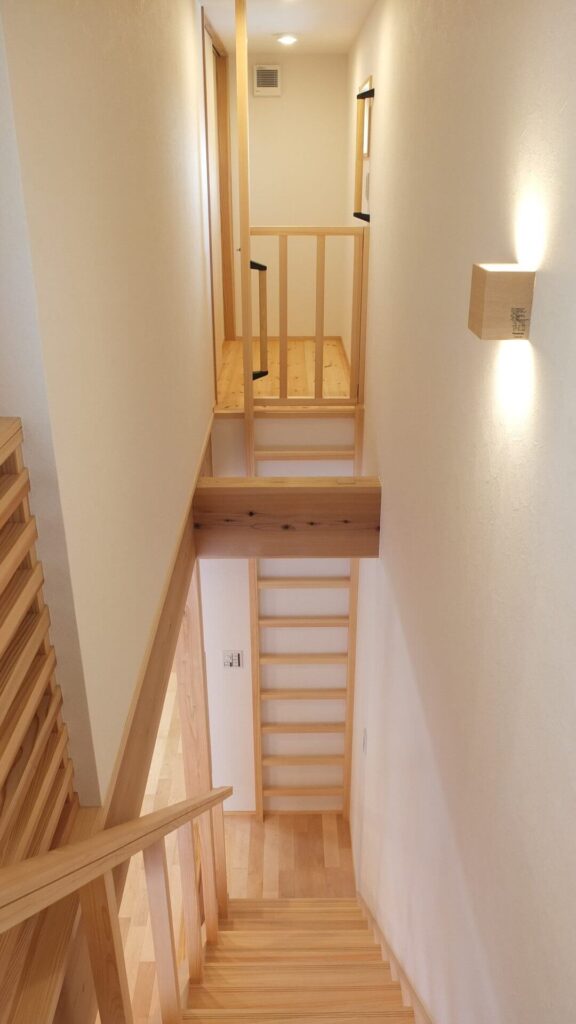 1年半ほど前に開催された完成見学会(『INandOUT』稲沢市mi様邸)に当時はまだ計画をスタートされたばかりのyoyo様がご来場されました。mi様邸には小さいお子さんが喜んで遊べる仕掛けがあちらこちらに、yoyo様の一人娘ERIちゃんも目を輝かせて体感していました。特にリビングから2階へと掛かるハシゴがお気に入りの様子で、ひとしきり見学を終えた後に『うちにもハシゴが欲しい』と。そんな話を聞いてしまった以上はこの筆者、『必ずつくってみせる!』と息巻いて計画に取り組みました。様々な制限を加味しながらプランを進め、リビングからERIちゃんの部屋へと続く『ヒミツの通路』としてのハシゴが完成しました。(実は『ヒミツの通路』とする事にも『準防火地域の三階建て』と『高度地区』の制限が少々関係してくるのです。)