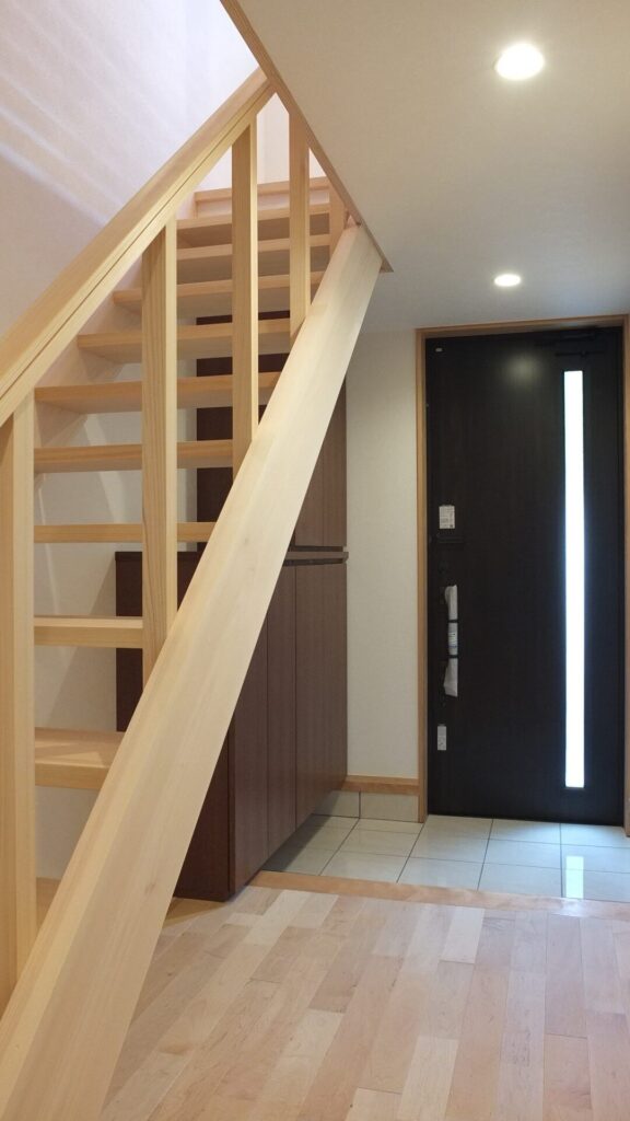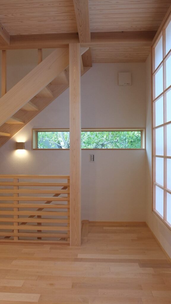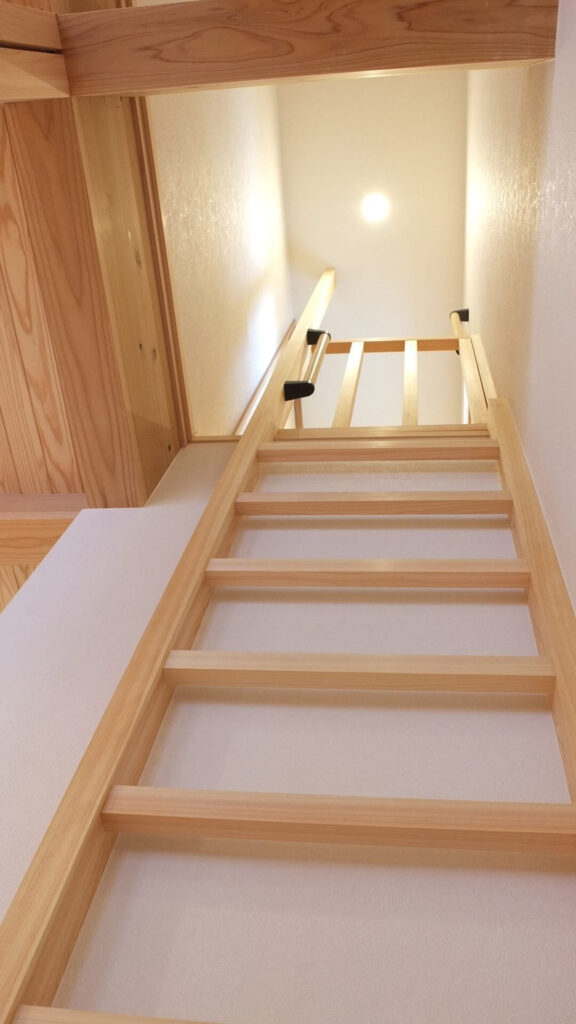 昨年のk保木棟梁に続き若手大工h谷川君が親方の元を離れて一人で担当した記念すべき住宅です。(狭小地で作業車の駐車スペースも限られるため、ハイ●ースに乗っている棟梁が多い中で唯一軽バンに乗っているh谷川君にお願いした、というのが真相ですが)先輩のk保木棟梁も手伝いに来てくれましたが、二人ともさすがは親方の元で厳しい修行をしてきただけあって、各所の収まりも非常にキレイでした。特に階段の手摺の造作は、どこからビスを打って固定しているのかが分からないような見事な加工。親方のk棟梁が『ずっと棟梁として飯を喰っていけるように』とh谷川君の腕に仕込んだ技術が早くも活かされた事例となりました。