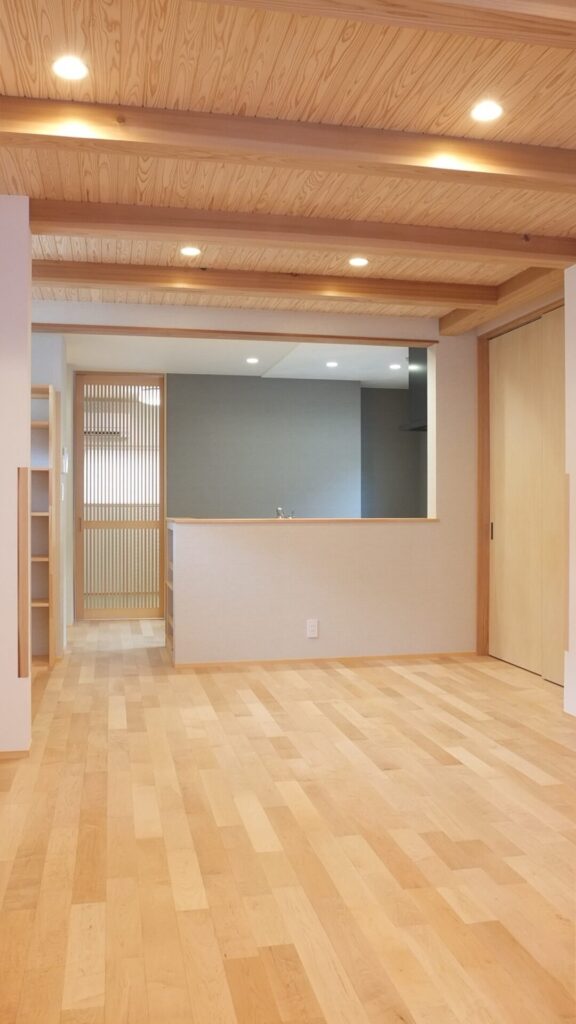 結果、コンパクトながらLDKは木表しのインテリアで広がりを感じられ、外部に対して閉じたいところは閉じ開きたいところは開く、ご近隣の樹木等の借景にも恵まれ、非常に印象的な空間となりました。
