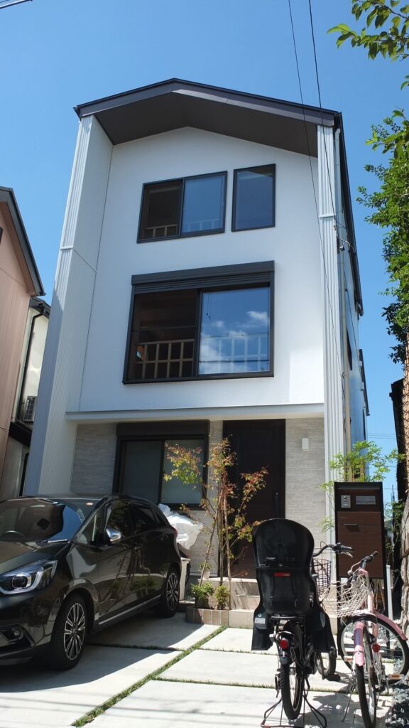 狭小地につき空間を上部へと求めるため木造3階建てとした時に要求される『許容応力度計算』、『準防火地域』による構造や仕上の制限、『高度地区』による高さの制限、『地区計画』による配置、外観の規制など。