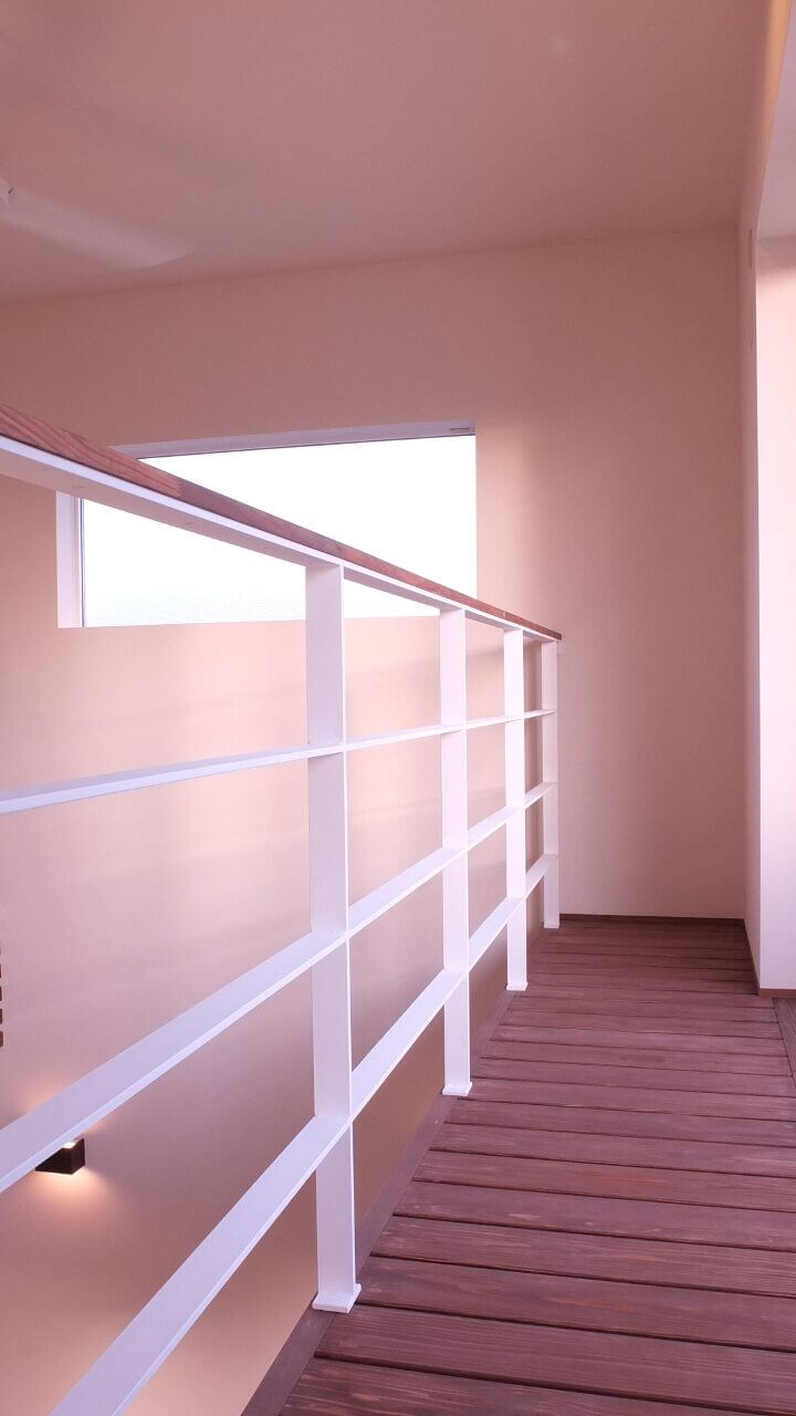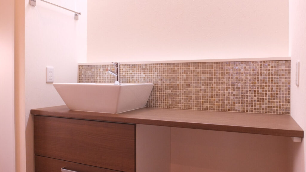 内装は純白の壁や建具(:垂直線)と、濃いウォルナットフロア(:水平線)のコントラストで美しくまとめられ、ところどころに散りばめられたモザイクタイルがちょっとした贅沢感を演出する、どことなくレトロモダンな雰囲気が漂う仕上がりとなりました。